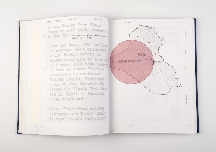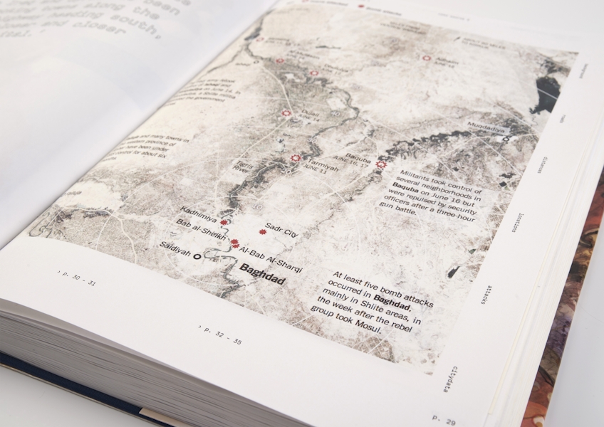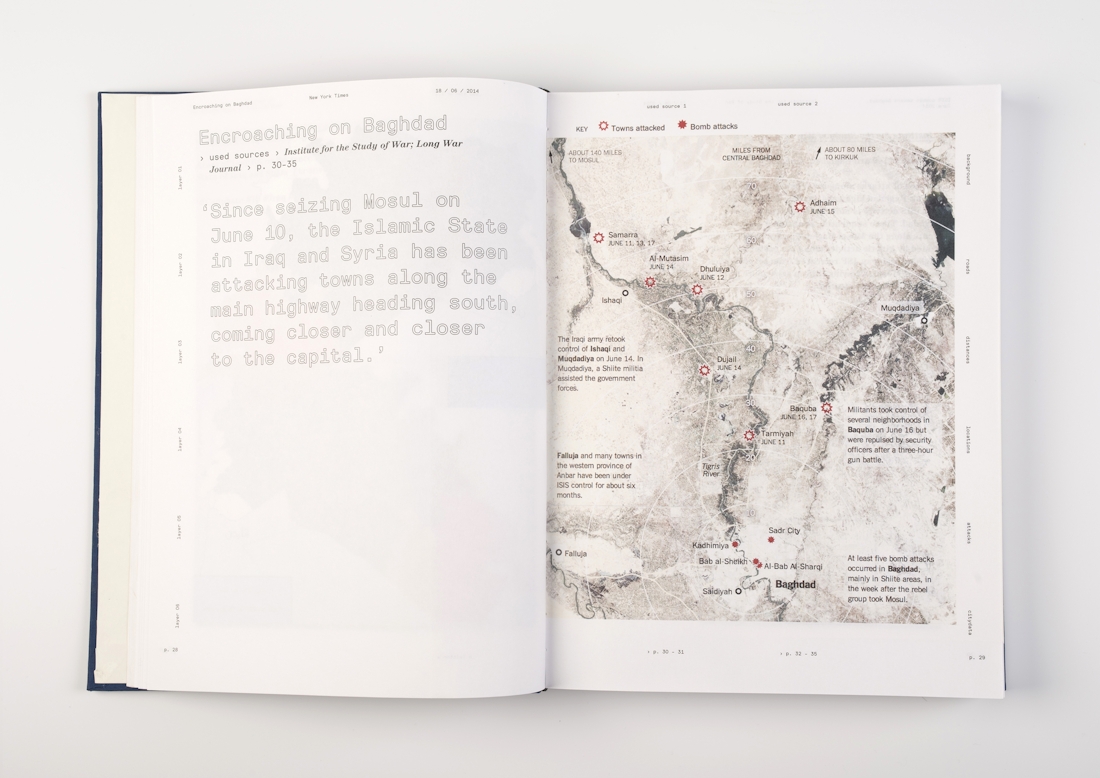 De atlas Cartographic ‘Islamic State’ and its sources bevat een verzameling van alle kaarten van april tot en met juni 2015 over de IS, gepubliceerd door de New York Times. De kaarten bestaan uit een aantal lagen, zoals een achtergrond, symbolen en informatieve data. Waar komen deze lagen vandaan? Heeft de New York Times deze lagen uitgebracht of hebben ze hiervoor bronnen gebruikt? Welke bronnen en elementen uit deze bronnen hebben ze dan gebruikt? Hoeveel kaarten zijn er gebruikt voor het maken van één kaart?