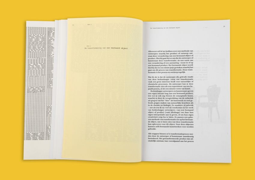 Transformaties, Tools & Documentaties als Vorm van Proces is een uitgebreid onderzoek naar ontwerpmethodes van hedendaagse ontwerpers en kunstenaars. Het overkoepelde thema wat we ontdekte is dat kunstenaars en ontwerpers voornamelijk ‘vernieuwend’ willen zijn. Steeds vaker wordt er ontworpen vanuit verschillende disciplines als scheikunde en technologie.