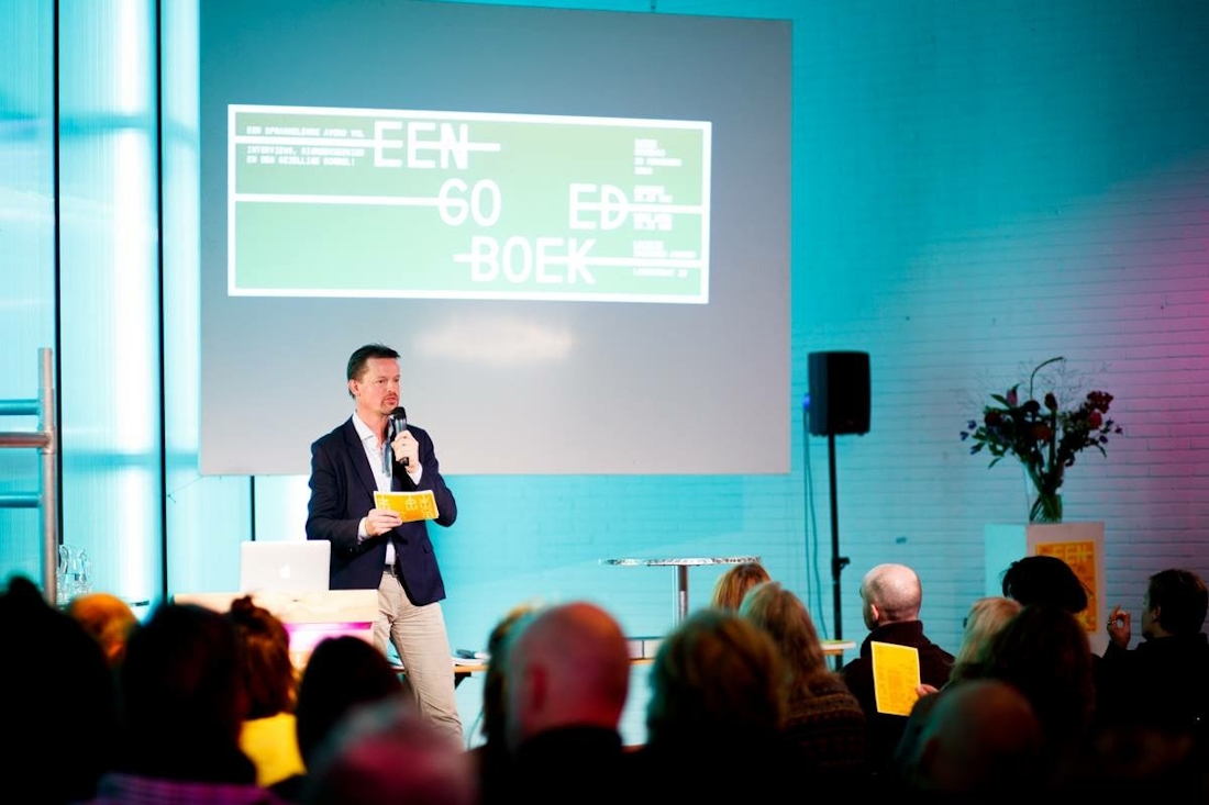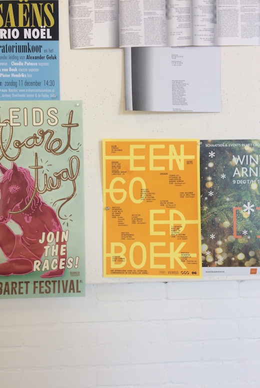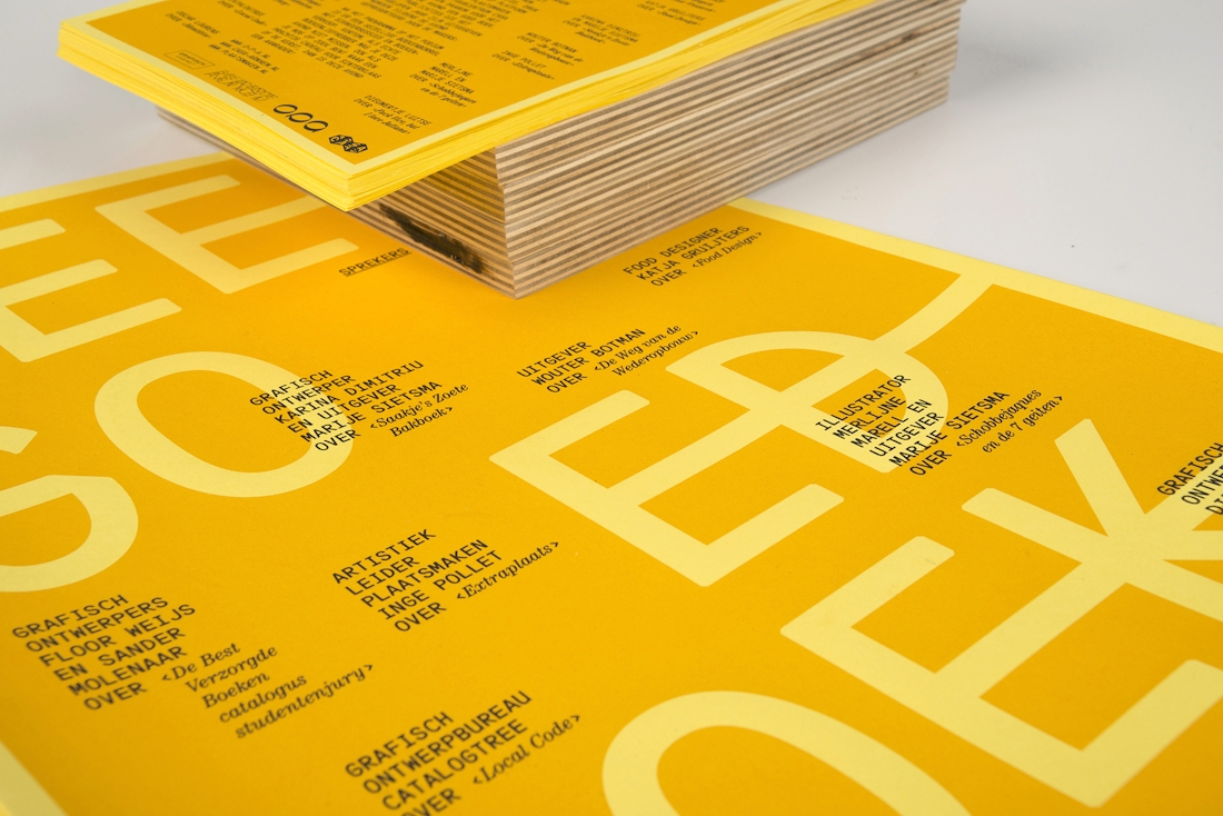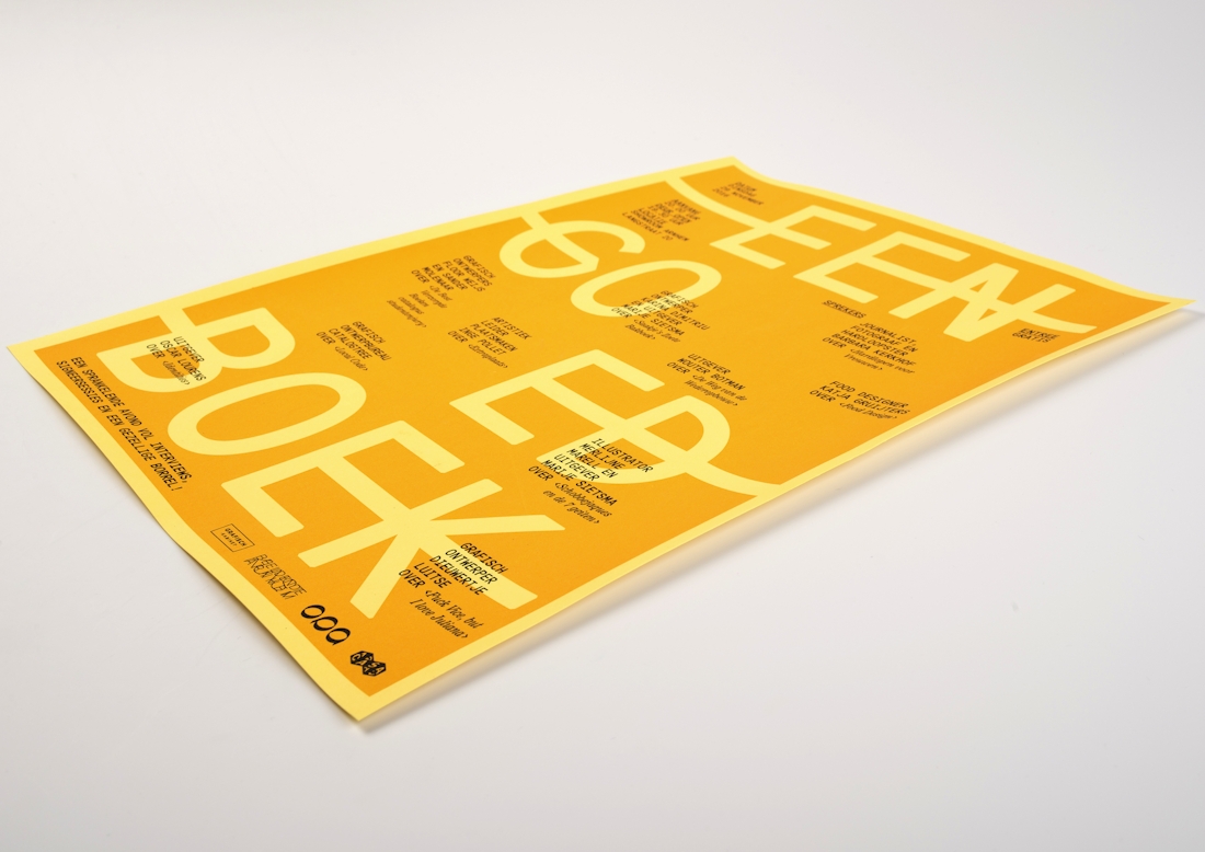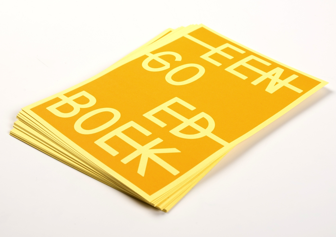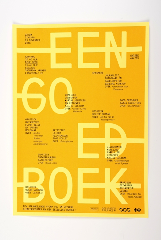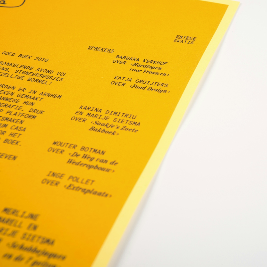 Ook voor de eerste editie van Een Goed Boek avond in 2016 hebben we de identiteit mogen ontwerpen. Hierbij hebben we ook gewerkt met de zeefdruk-techniek om de kleuren eruit te laten knallen. In plaats van een kleur op wit papier te drukken, hebben we het omgedraaid en okergeel gedrukt op geel papier, en daar overheen nog eens een keer een zwarte laag met tekst gezeefdrukt. Deze data staat speels over het gehele ontwerp verdeeld, binnen de typografische ‘boekenkast’.