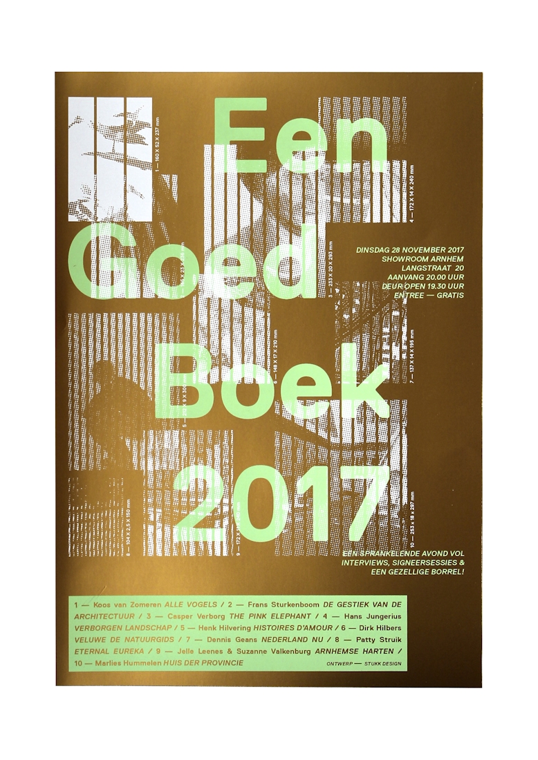 Het ontwerp van de posters, wikkels en flyer voor Een Goed Boek 2017 is ontstaan uit een visueel experiment. We wilden een bijzondere representatie maken van de 10 geselecteerde boeken die werden gepresenteerd tijdens deze avond. We hebben de hoogte, de breedte en de dikte van de boeken in kaart gebracht en deze verhoudingen vertaald op de poster, waarbij het totale beeld boeken op een boekenplank representeert. De afbeeldingen van de boek-representaties op het ontwerp komen letterlijk uit de boeken zelf.