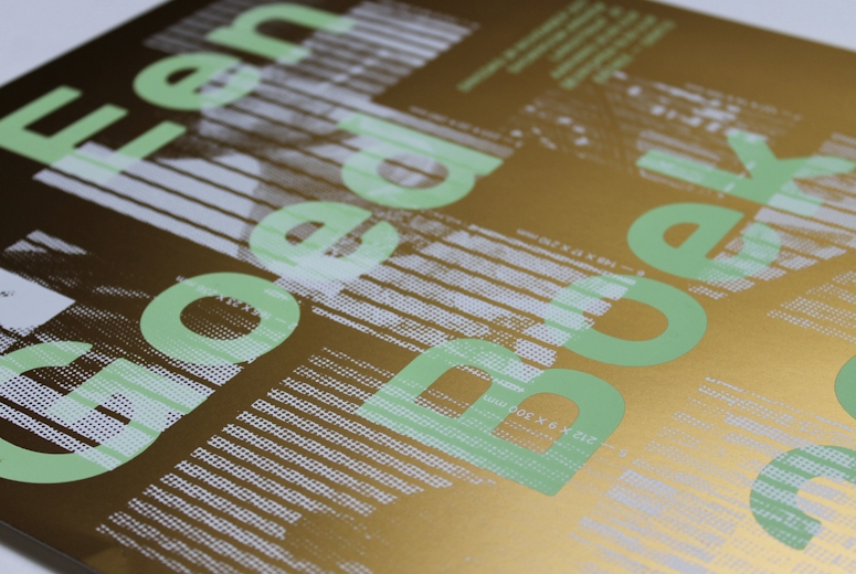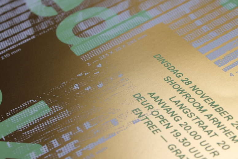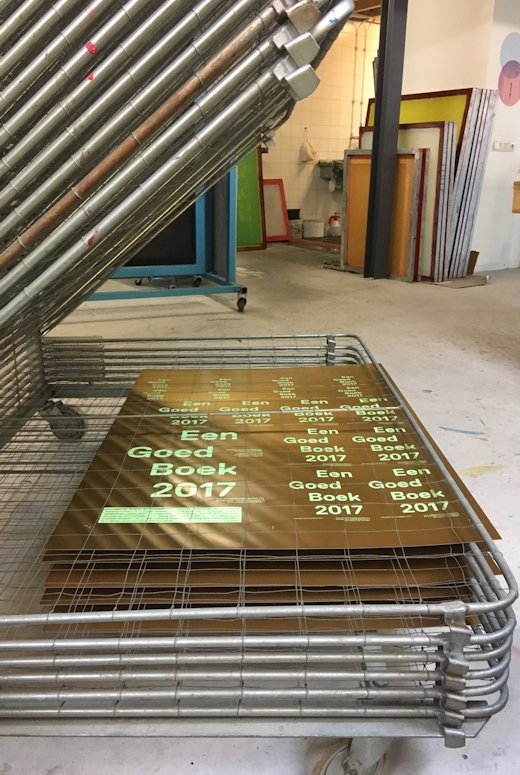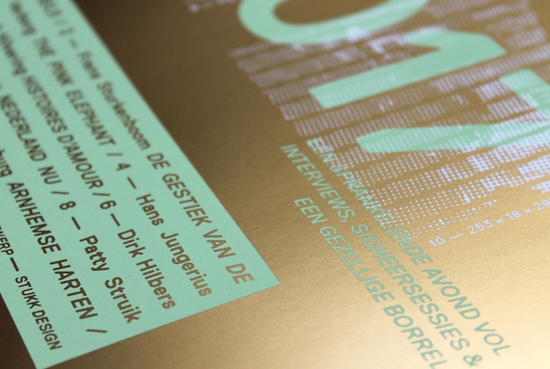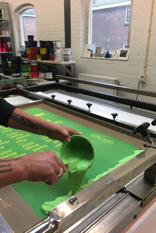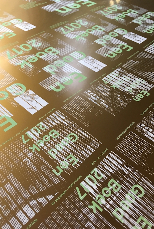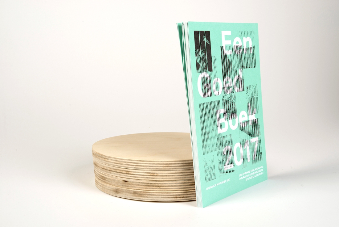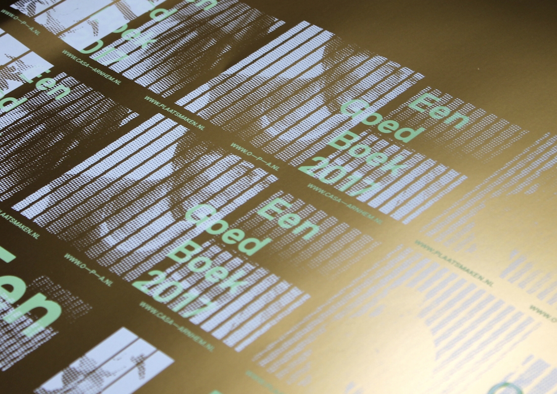 Wij werken altijd met eigenzinnige materialen en druktechnieken. Een Goed Boek is eigenlijk een boeken-feest. Daarom hebben we gekozen voor goudkleurig papier. Daarnaast hebben we gekozen om het ontwerp te zeefdrukken. Deze techniek geeft het ontwerp diepte, omdat je laag over laag kan drukken. Je ziet, ruikt en voelt het. Daarnaast kan je gebruik maken van bijzonder kleuren, die je niet kan bereiken met digitaal drukwerk. Op deze manier kwam de identiteit voor het feestje Een Goed Boek 2017 goed tot zijn recht.