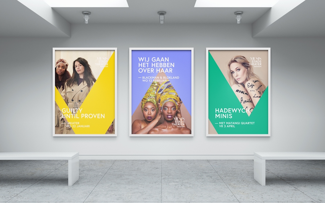 Vanuit de basis van Musis & Stadstheater — het logo — hebben we het systeem ontwikkeld. Een identiteit die opvallend, minimalistisch maar toch speels is. De driehoek in zijn verscheidenheid van plaatsing op het vlak, vormt een eenheid door de samenwerking van geometrie, typografie, kleuren en restvormen.
